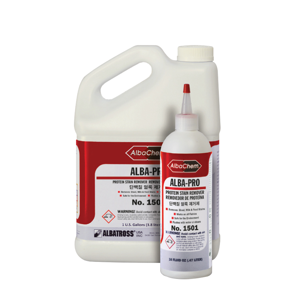 ALBA-PRO penetra y remueve manchas orgánicas difíciles (manchas de sangre, leche y alimentos); de ropa, uniformes y ropa de cama.