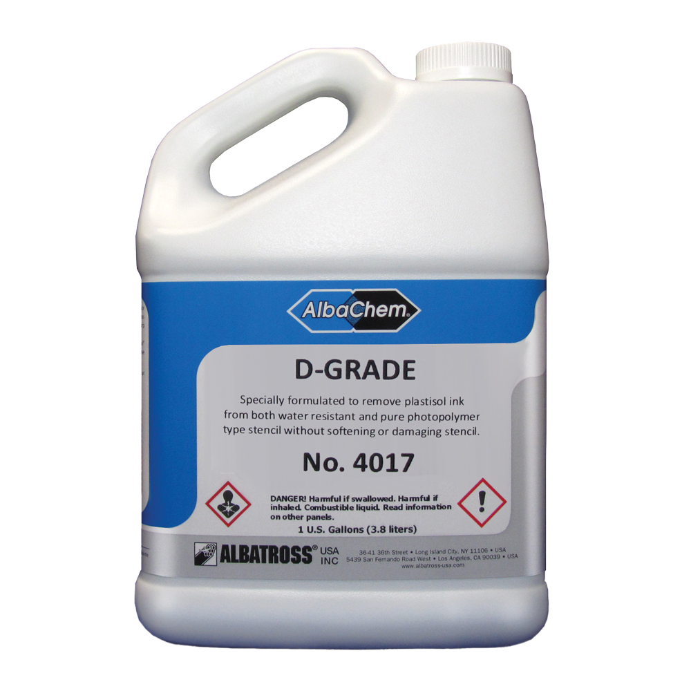 Limpiador de Mallas descompone rápidamente plastisol, disolventes, tintas de gráficos y otros tipos de tintas de serigrafía. Un limpiador muy potente con olor bajo, D-Grade hace que el proceso de reclamación sea rápido y fácil.