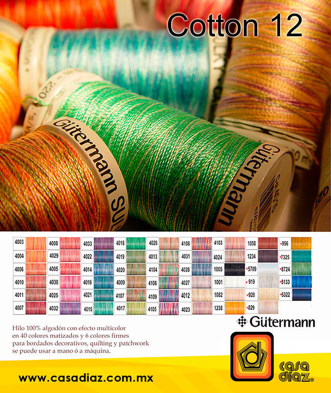 Hilo 100% algodón con efecto multicolor en 40 colores matizados y 6 colores firmes para bordados decorativos, quilting y patchwork, se puede usar a mano o a máquina.