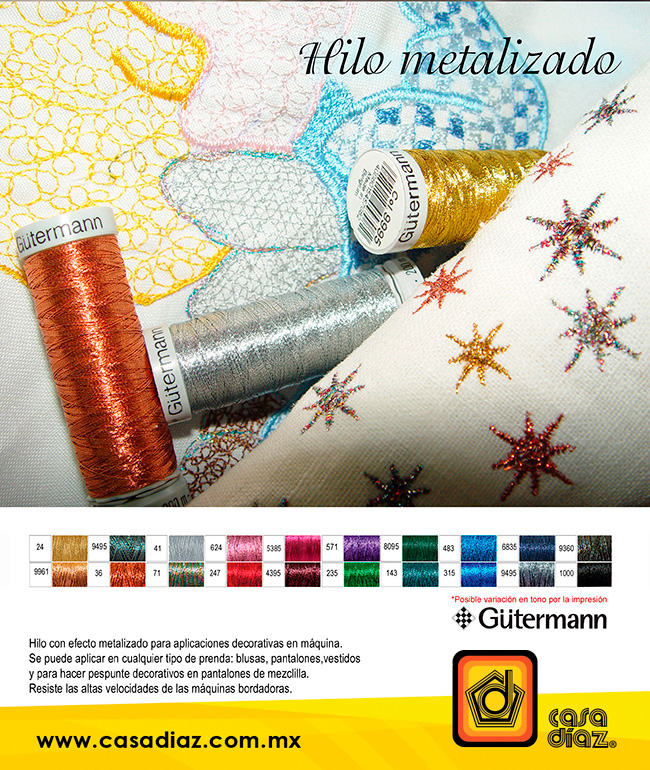 Hilo con efecto metalizado para aplicaciones decorativas en máquina.