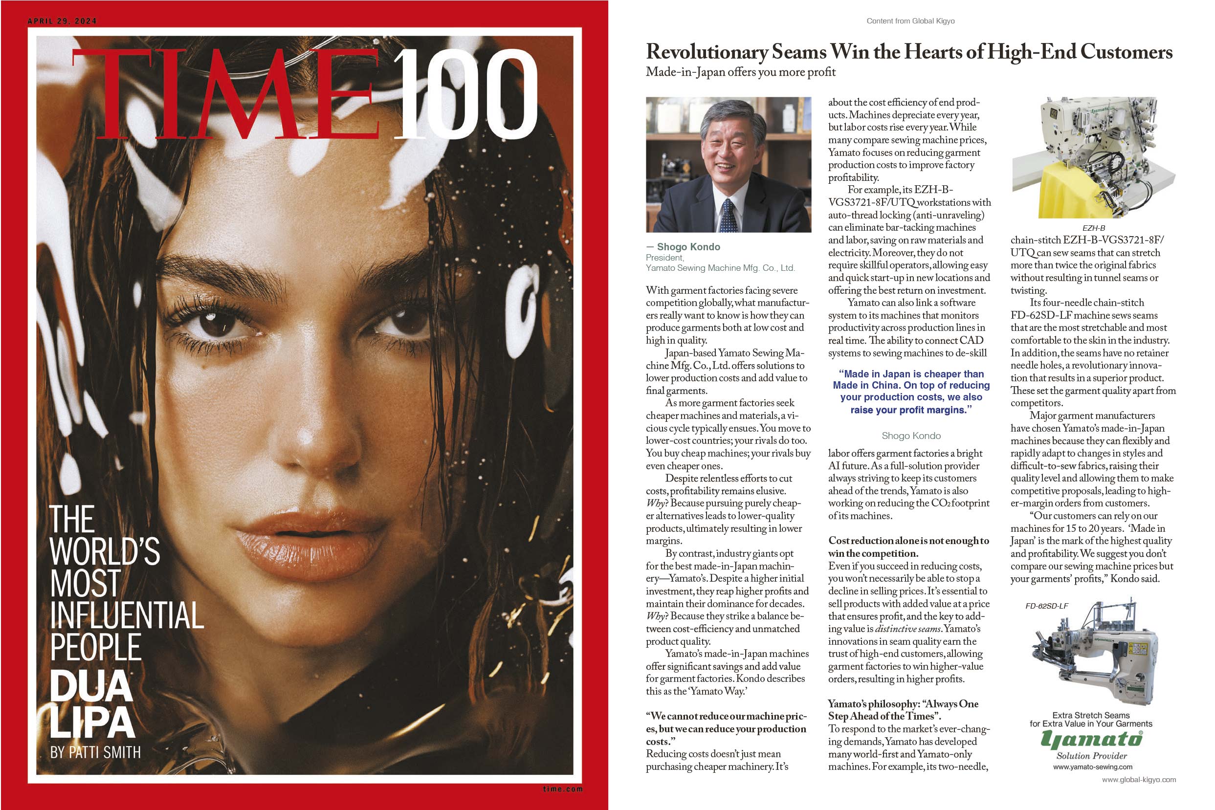 Los principales fabricantes de prendas de vestir han elegido el producto "Made in Japan" de Yamato máquinas porque pueden ser flexibles y adaptarse rápidamente a los cambios de estilos y telas difíciles de coser, elevando su nivel de calidad y permitiéndoles realizar propuestas competitivas, lo que lleva a mayores órdenes de margen de los clientes.