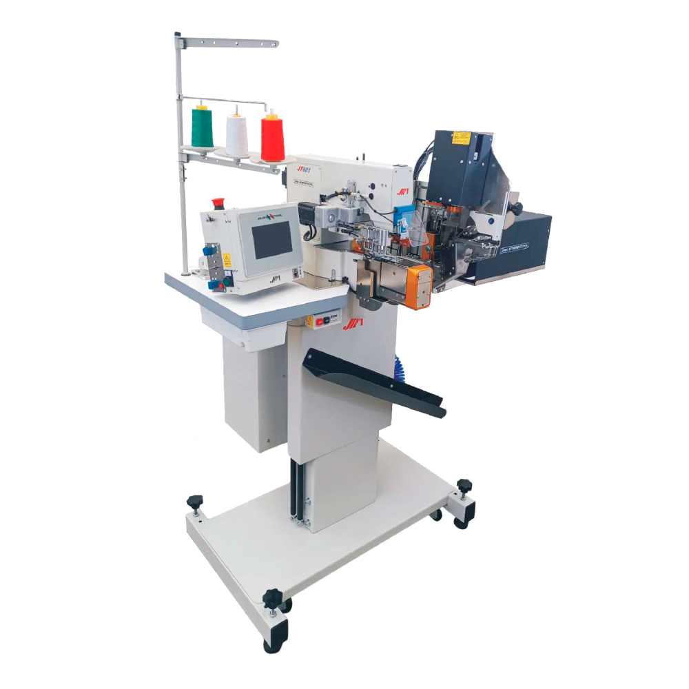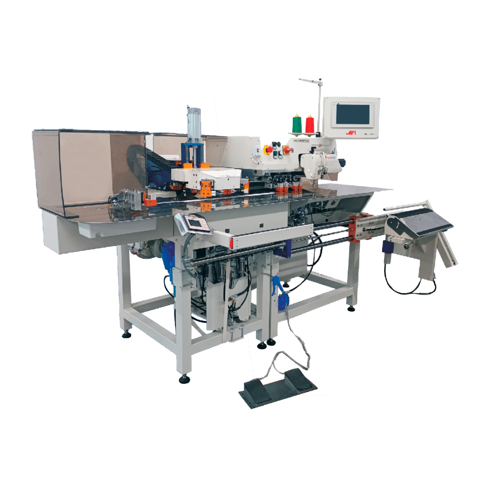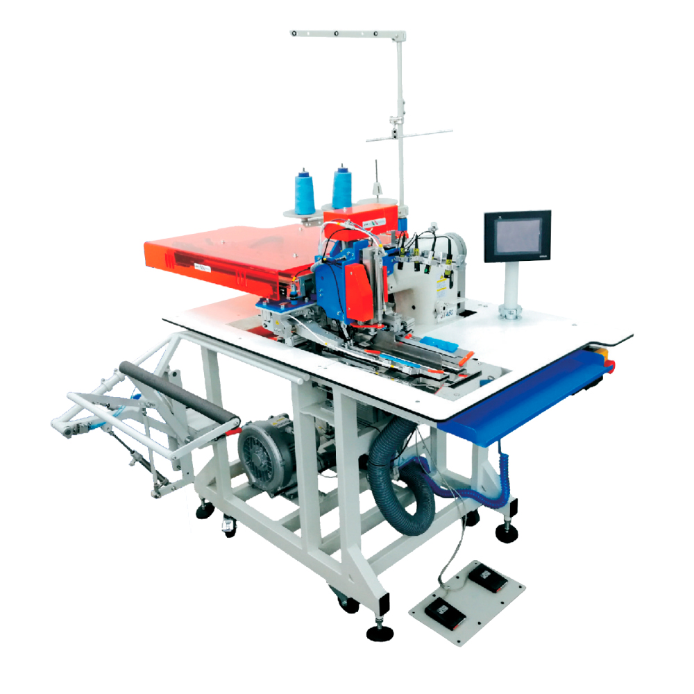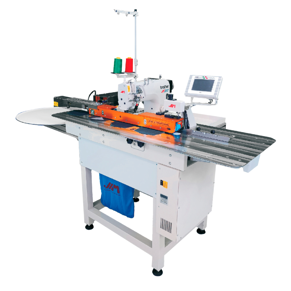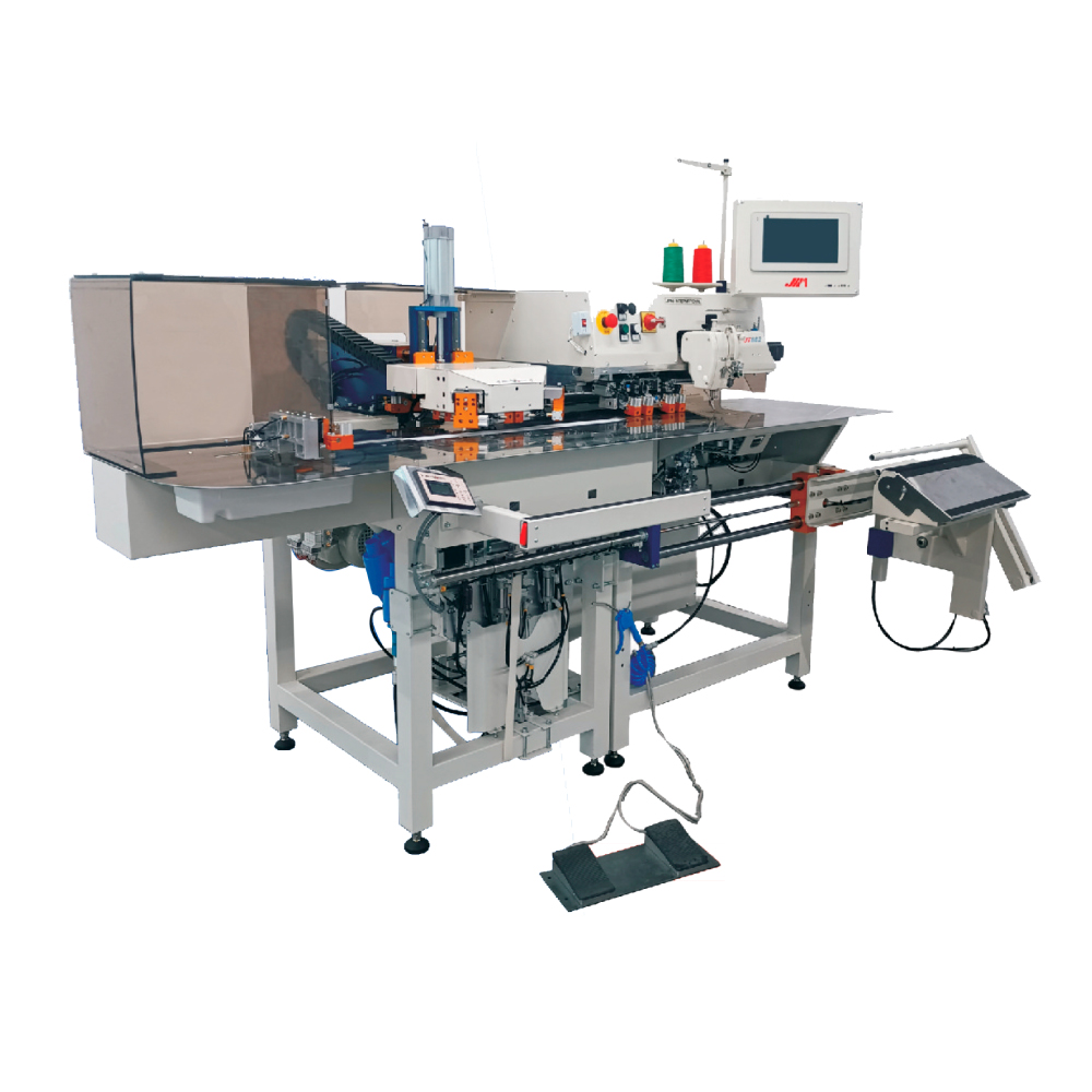 Máquina automática programable para realizar la costura de la “JOTA” en el pantalón. Una aguja, punto candado carga y apilamiento automáticos