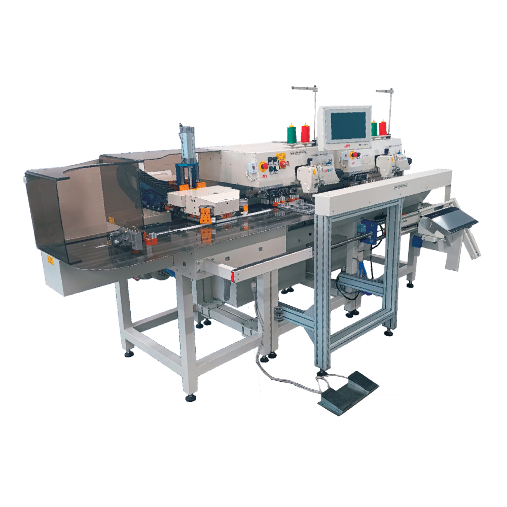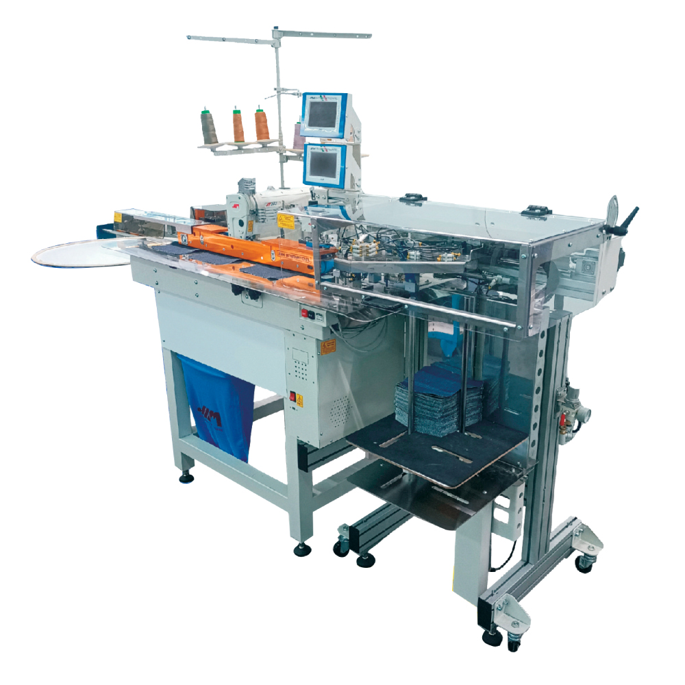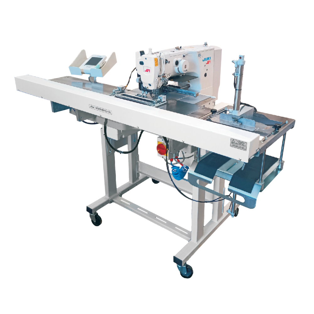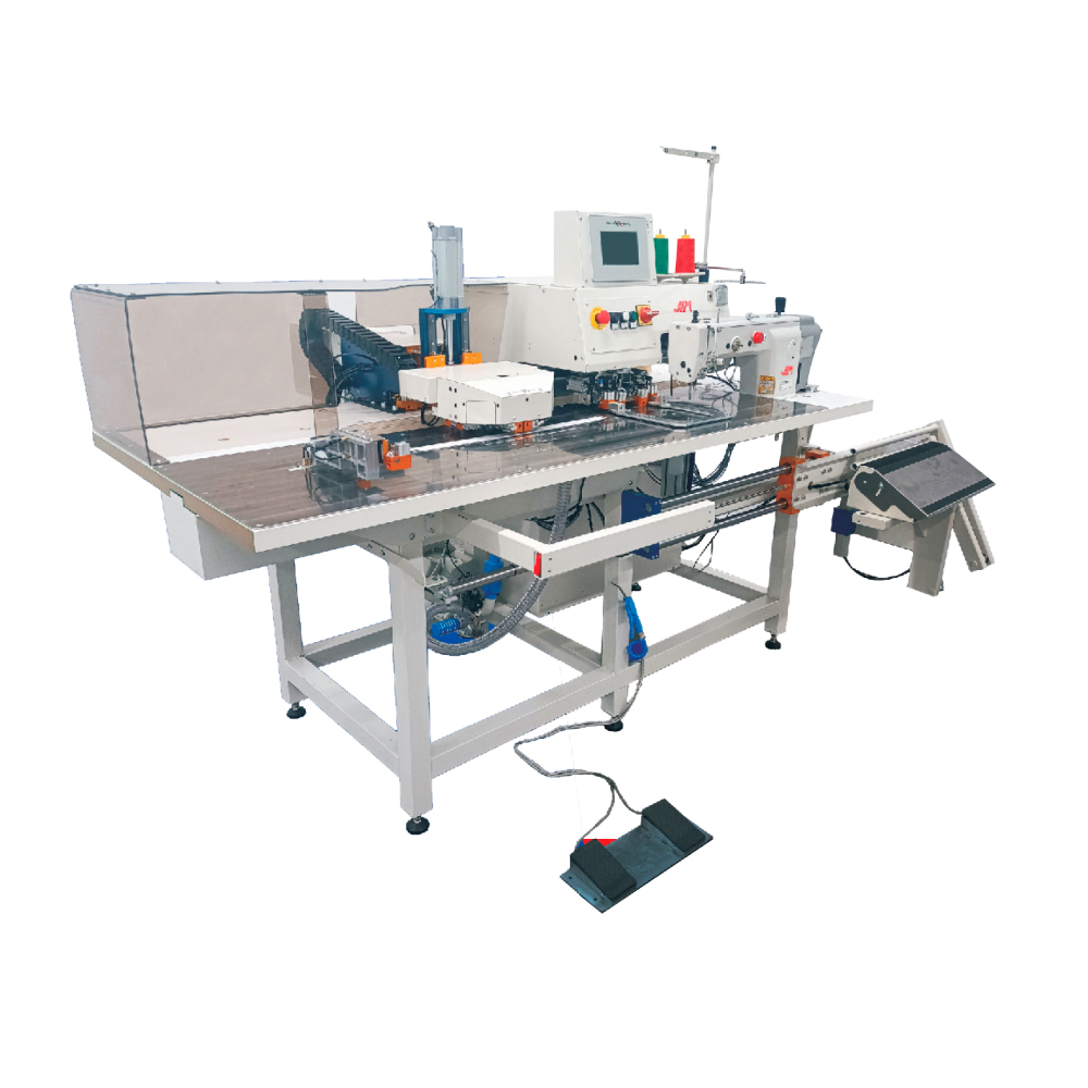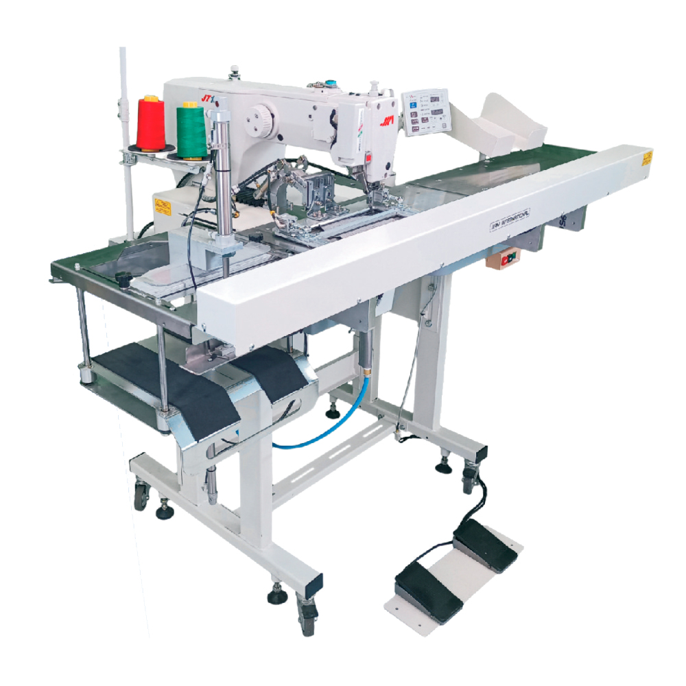 Máquina automática programable para realizar la costura de la “JOTA” en el pantalón. Una aguja, punto candado carga y apilamiento automáticos