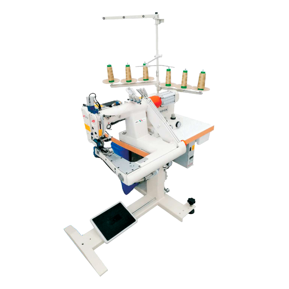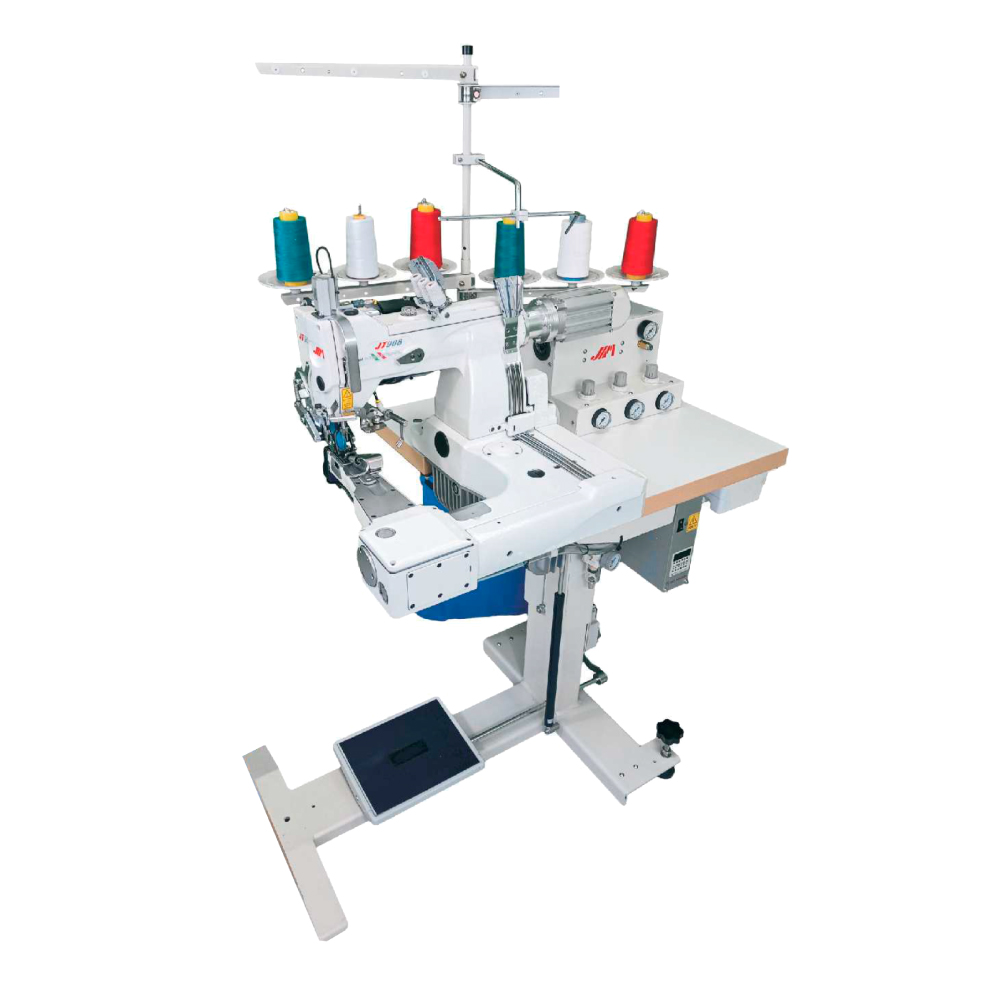 Máquina automática para ribetear bolsillos en jeans y similares, tres agujas punto cadeneta, doblador ajustable