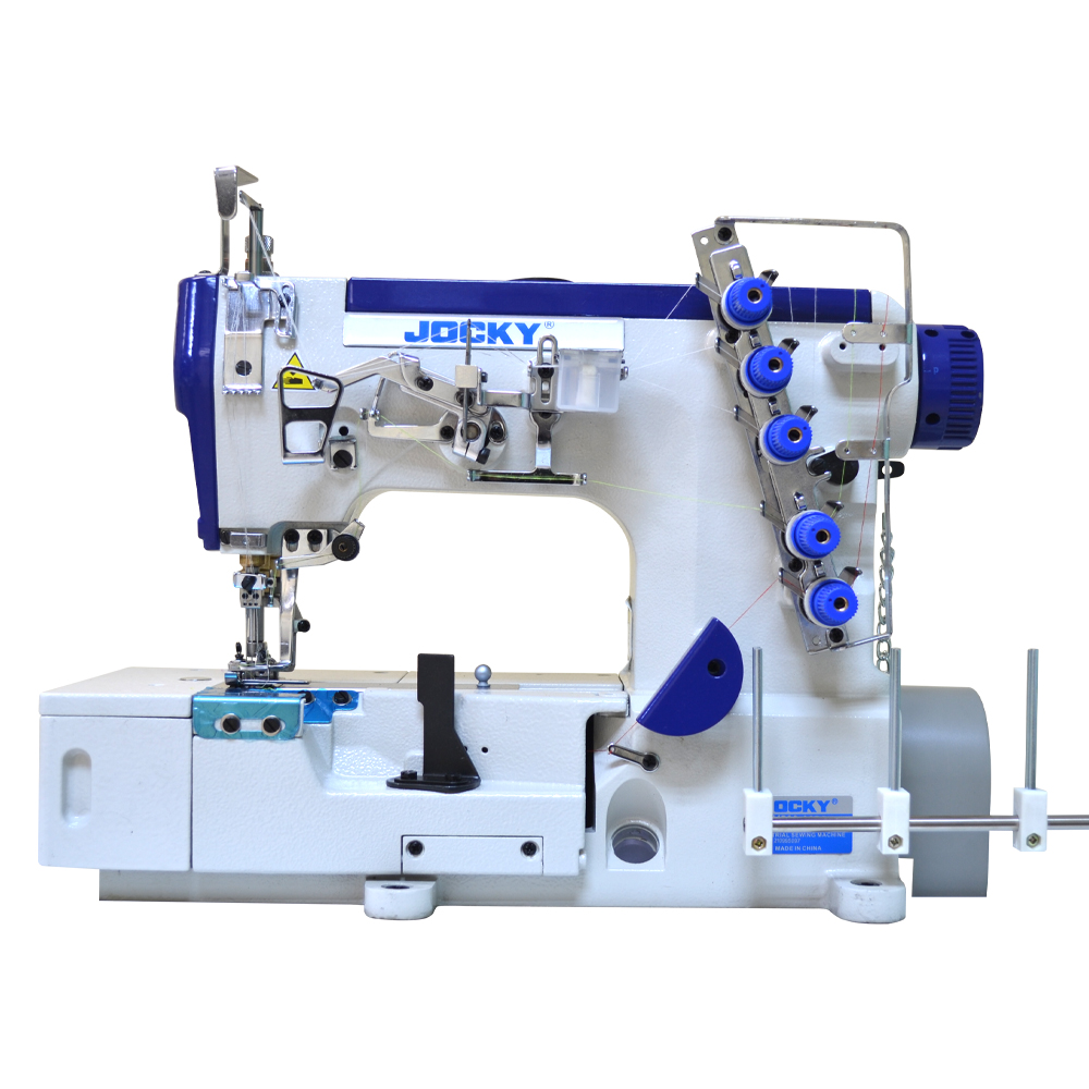 Máquina de costura interlock o Collarete de 5 hilos, 3 agujas , motor de clutch, 110 volts monofásico, ajuste de largo de puntada por medio de botón , lubricación automática, velocidad Máxima 5,500 RPM, con aparato para coser el bies.