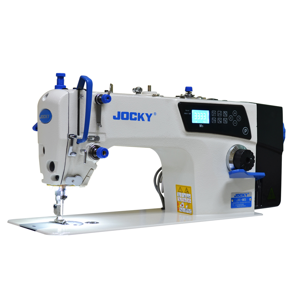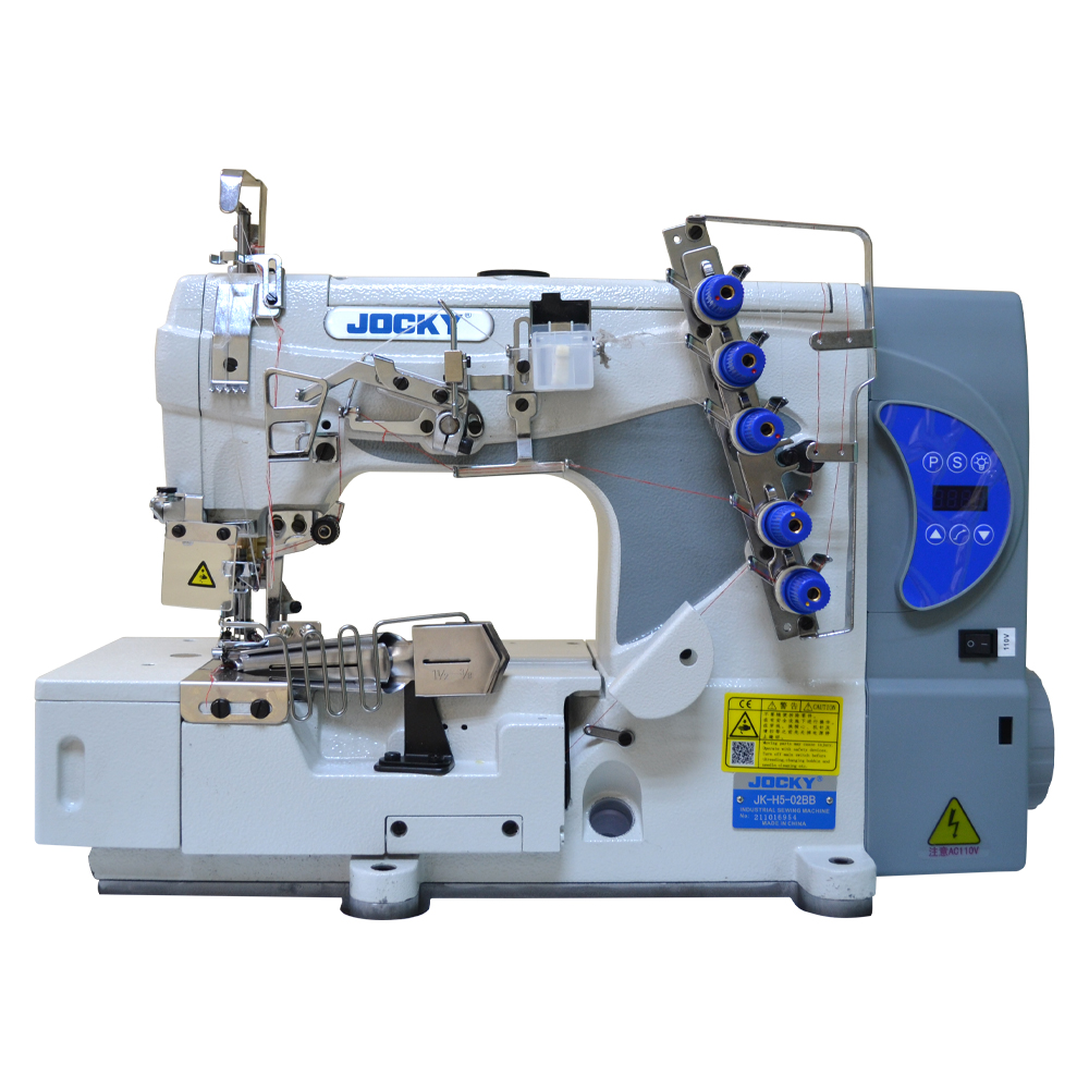 Máquina de costura interlock o Collarete de 5 hilos, 3 agujas, motor directo al cabezal, 110 volts monofásico, con panel directo al cabezal, ajuste de largo de puntada por medio de botón, lubricación automática, velocidad Máxima 4,500 RPM, con aparato para coser el bies. Luz led.