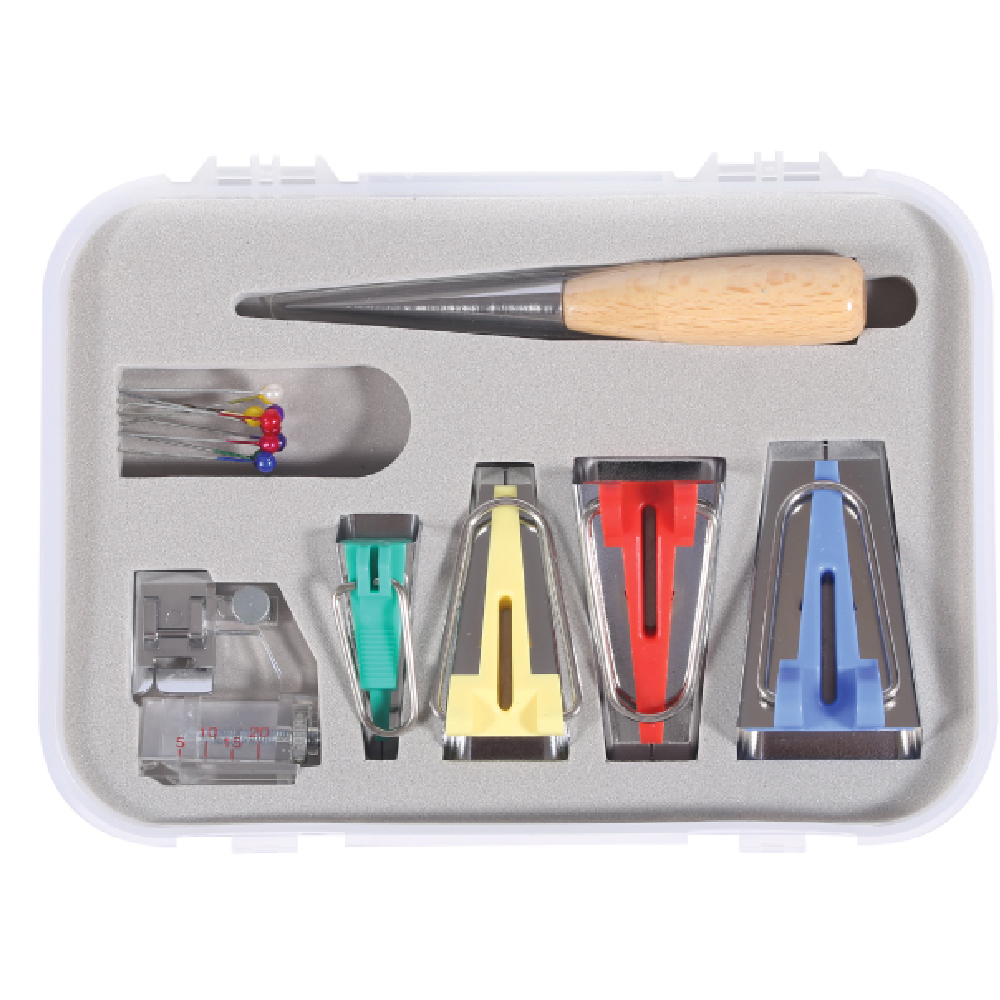 También contamos con las otras medidas de formadores de bies de 1/4", 1/2" y 1" para venta individual o bien en paquete con los 4 formadores, un punzón y el pie ribeteador genérico compatible con el 99% de máquinas familiares.