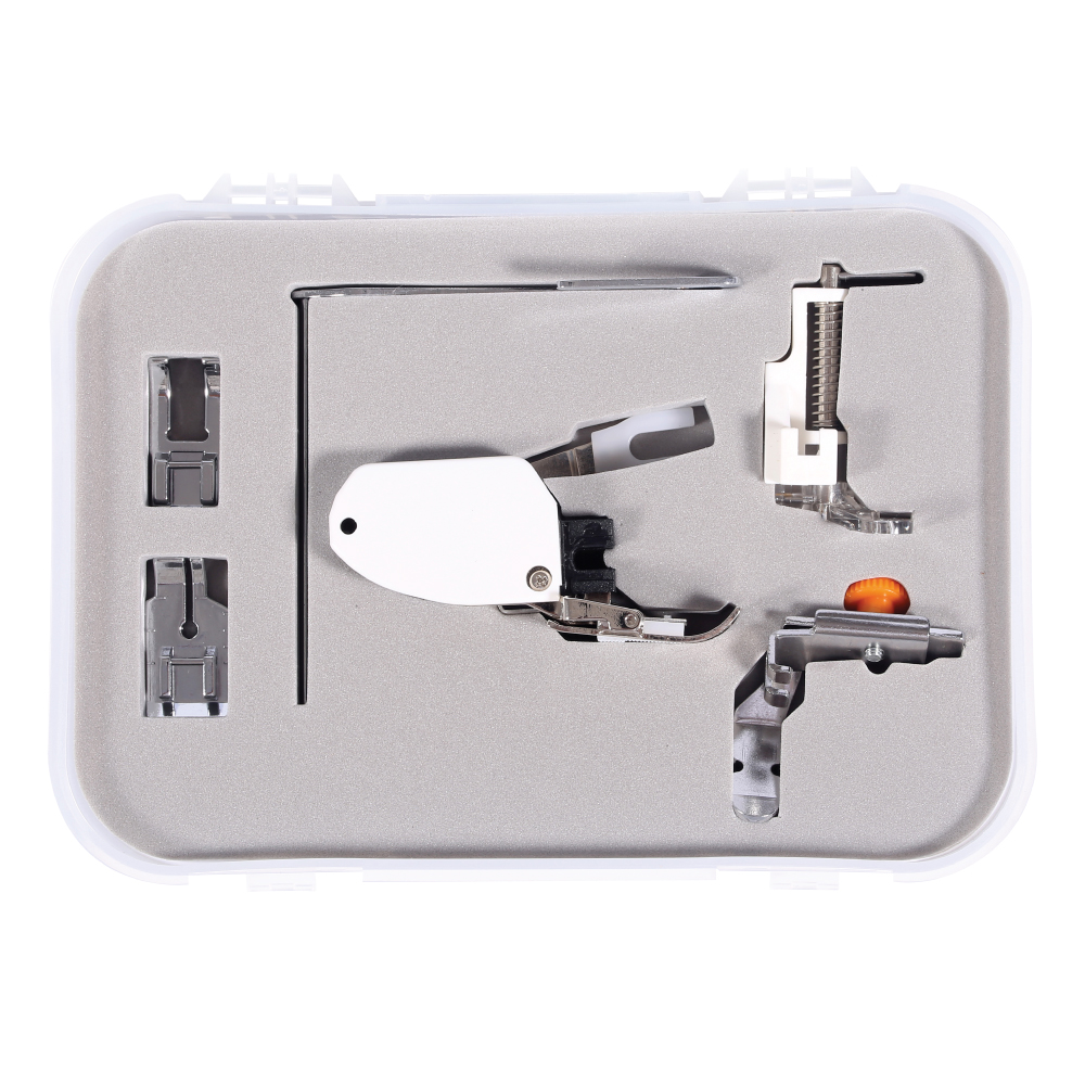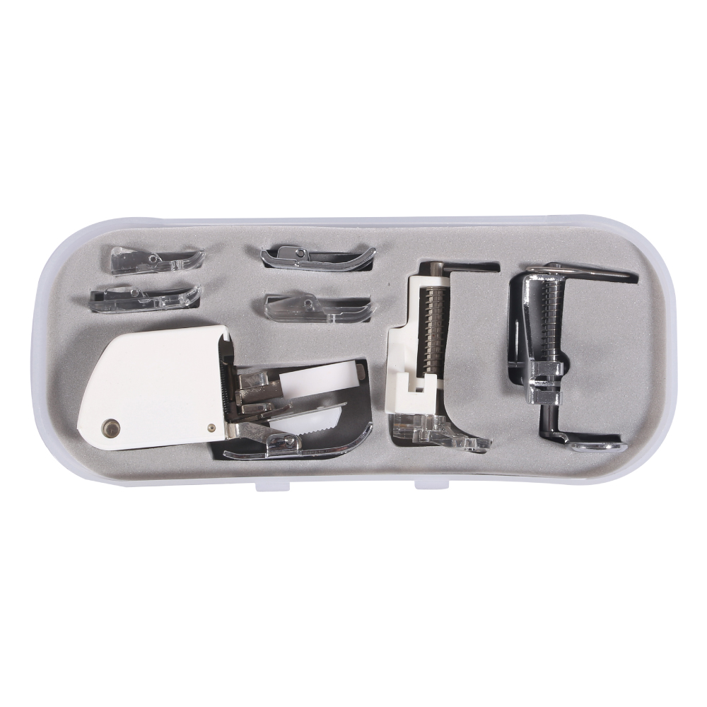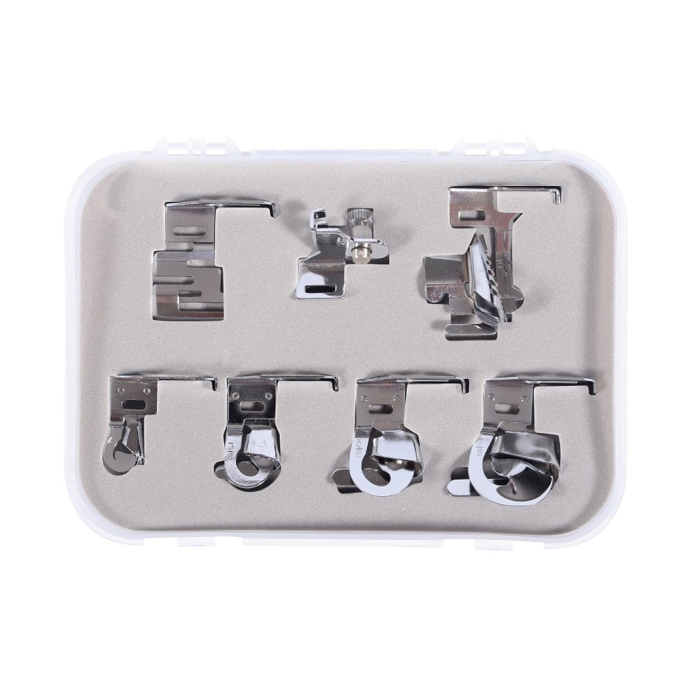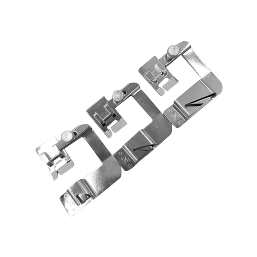 Kit de 3 pies prensatelas para dobladillo plano de los siguientes tamaños: 4/8"(13 mm), 6/8" (19 mm), 8/8"(25 mm).
