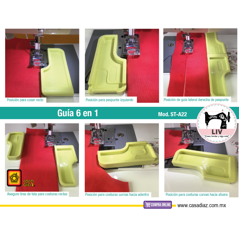 Las guías 6 en 1 " Stick 'n Stitch" se adhieren a la superficie de su máquina de coser con un gel adhesivo reposicionable y reutilizable que se fija permanentemente a la superficie de la guía.