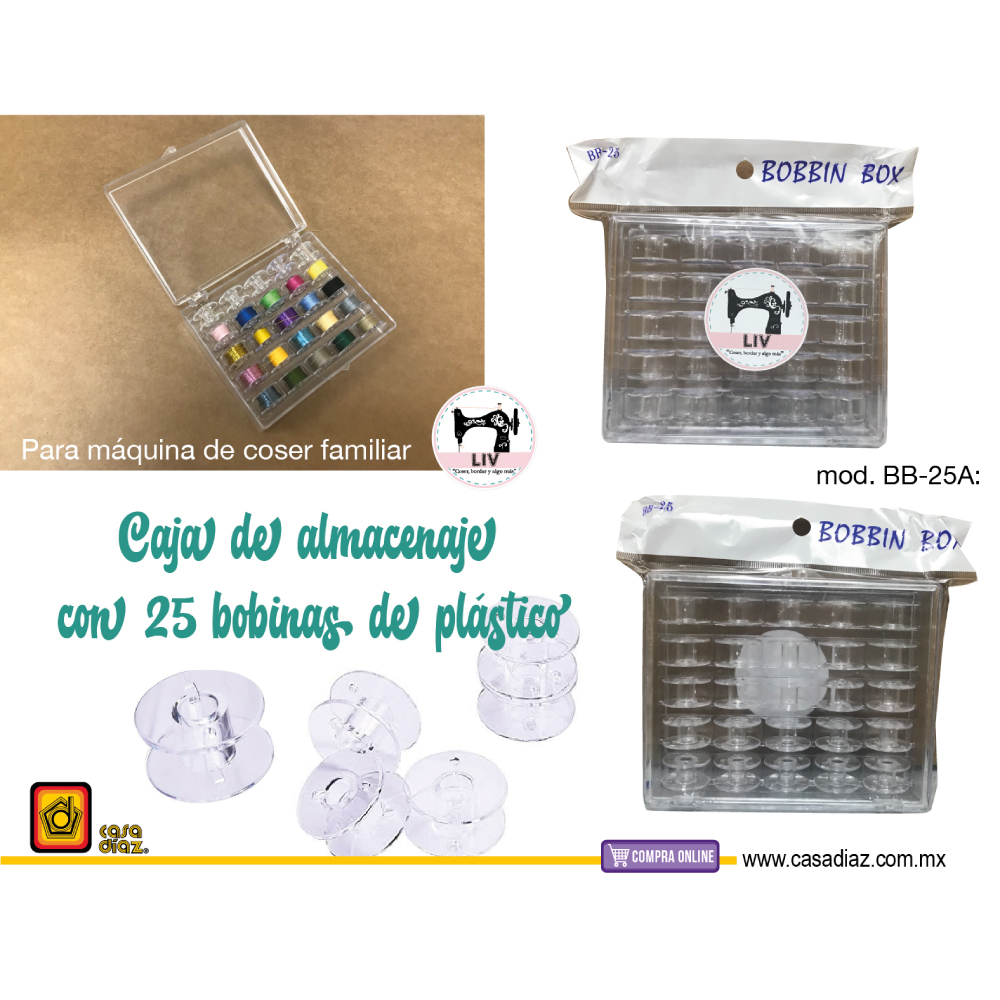 Cajita de almacenamiento con 25 bobinas para máquinas de coser familiares.