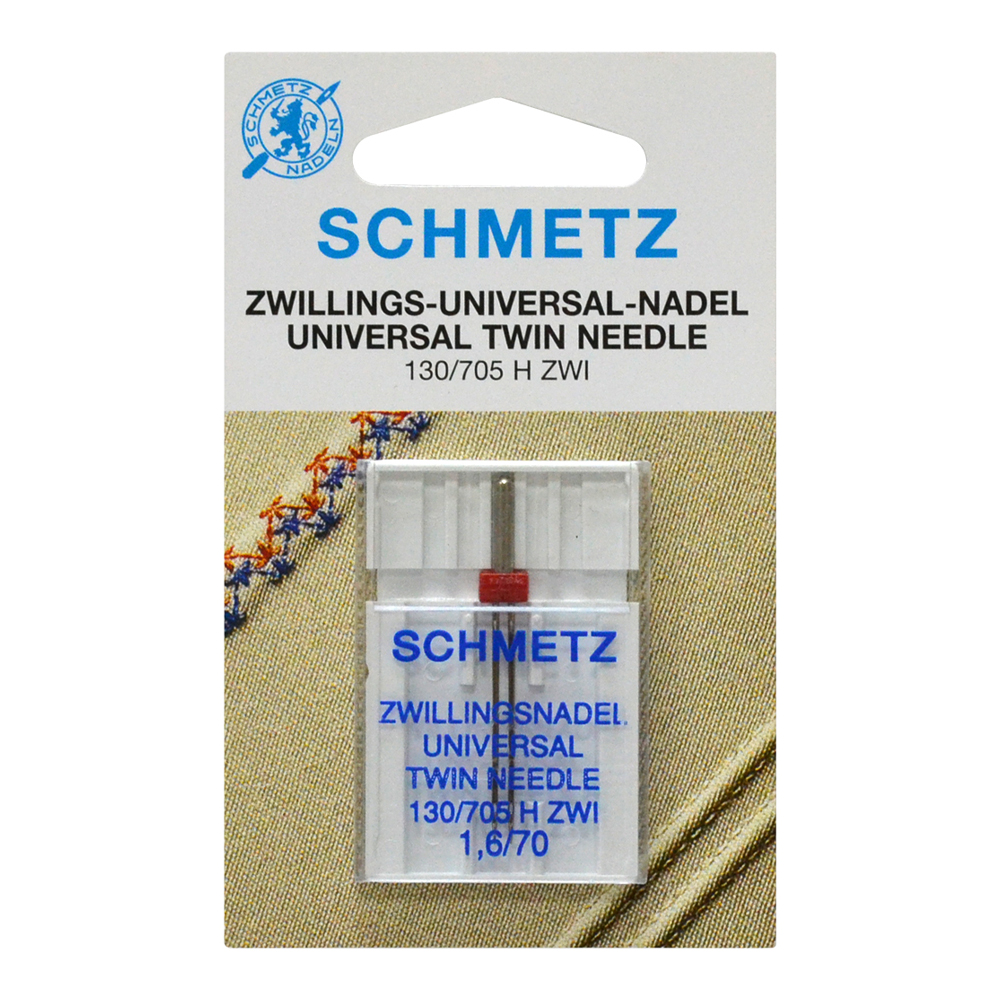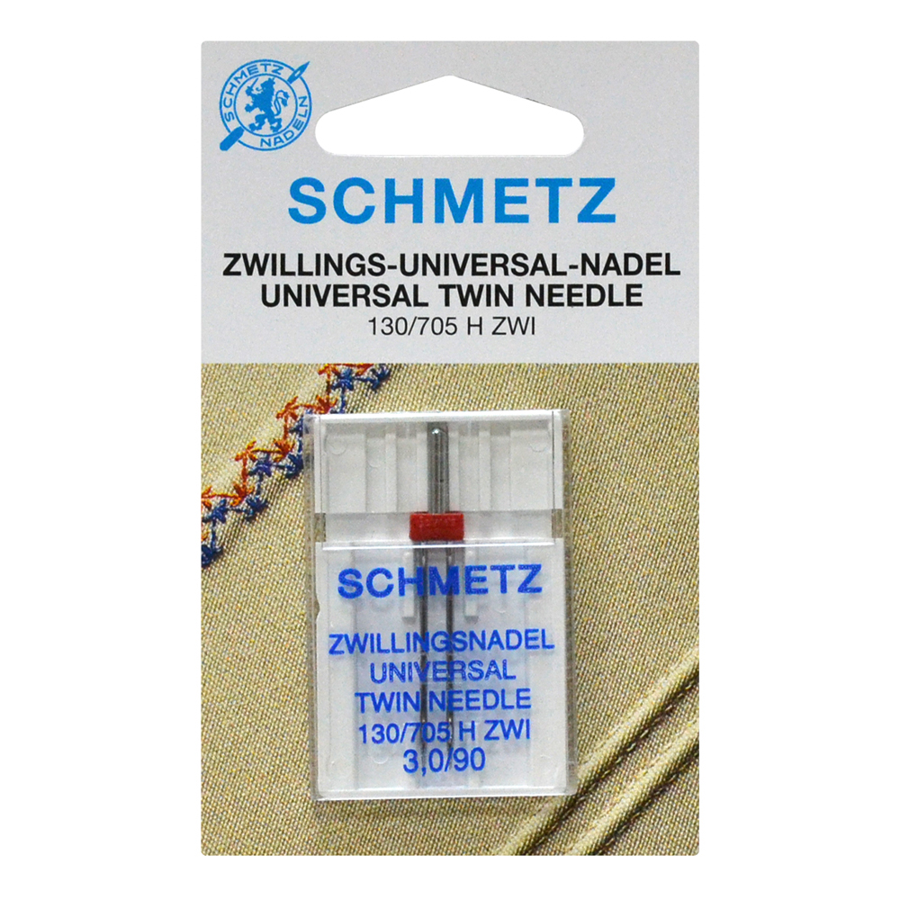 Aguja gemela con punta apenas redondeada, una gran aguja para múltiples usos con puntada recta, zigzag o decorativas. En estas últimas, se recomienda siempre hacer pruebas con el volante de la máquina; es decir, sin pisar el pedal para comprobar que la aguja no choque con el pie.